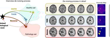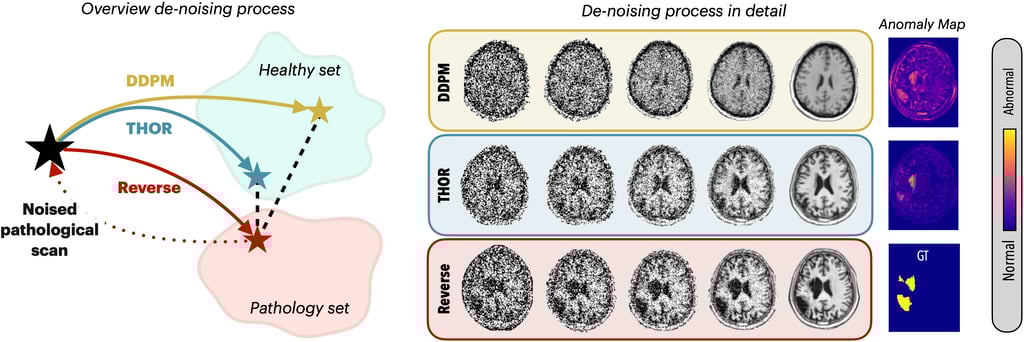 Abstract. Diffusion models have advanced unsupervised anomaly detection by improving the transformation of pathological images into pseudo-healthy equivalents. Nonetheless, standard approaches may compromise critical information during pathology removal, leading to restorations that do not align with unaffected regions in the original scans. Such discrepancies can inadvertently increase false positive rates and reduce specificity, complicating radiological evaluations. This paper introduces Temporal Harmonization for Optimal Restoration (THOR), which refines the de-noising process by integrating implicit guidance through temporal anomaly maps. THOR aims to preserve the integrity of healthy tissue in areas unaffected by pathology. Comparative evaluations show that THOR surpasses existing diffusion-based methods in detecting and segmenting anomalies in brain MRIs and wrist X-rays. Code: https://github.com/ci-ber/THOR_DDPM.